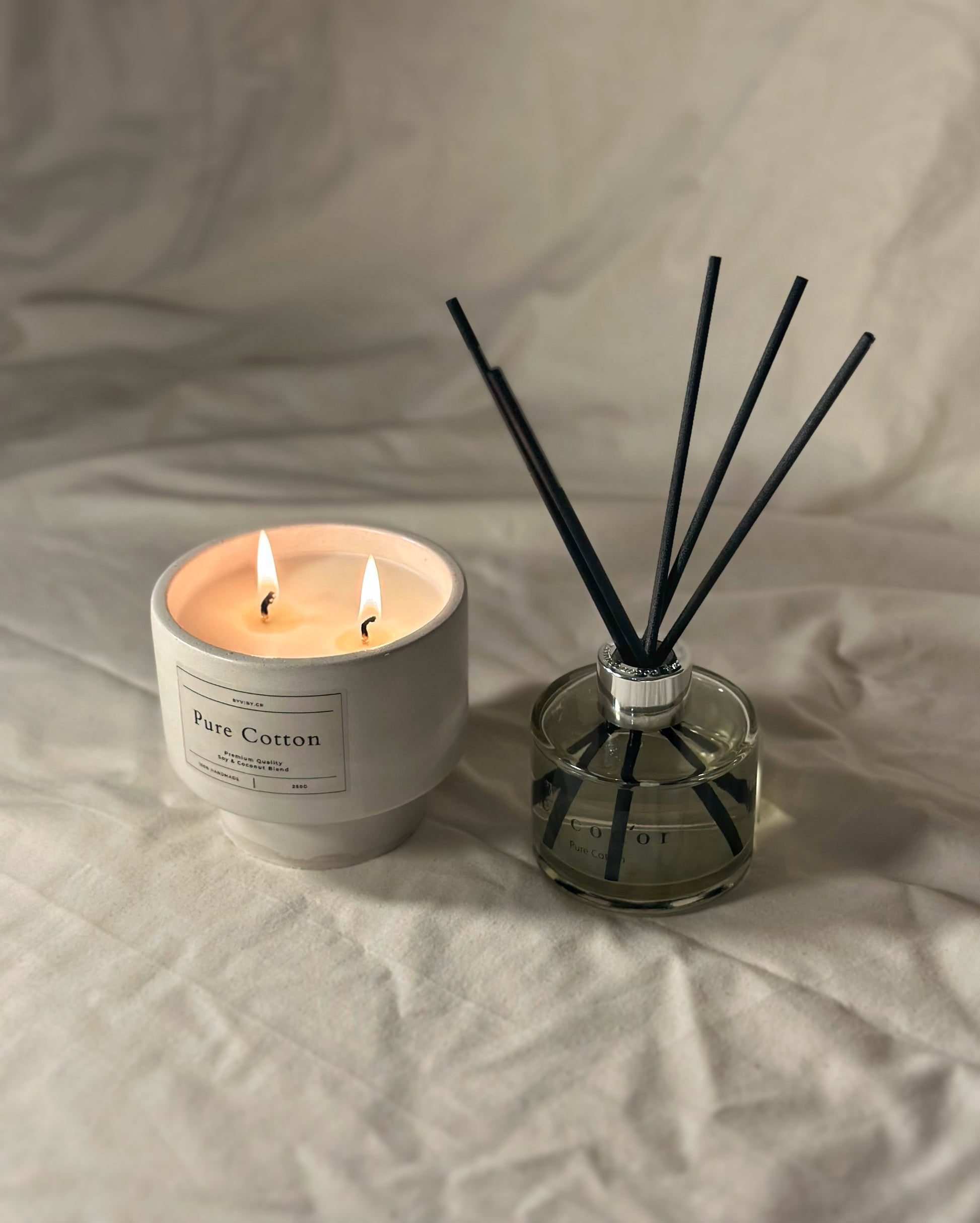 Σε χειροποίητο πορσελάνινο δοχείο, με premium οικολογικό blend σόγιας–καρύδας και δύο βαμβακερά φιτίλια για καθαρή, ομοιόμορφη καύση. Το άρωμα Pure Cotton γεμίζει τον χώρο με μια φρέσκια, απαλή, καθαρή αύρα.