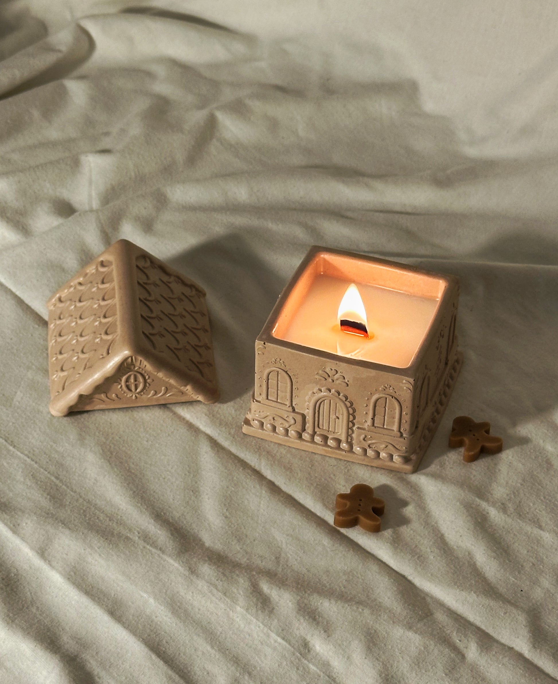 Ζήσε τη μαγεία των Χριστουγέννων με το Gingerbread House, ένα χειροποίητο κερί που μοιάζει με μικρό έργο τέχνης.