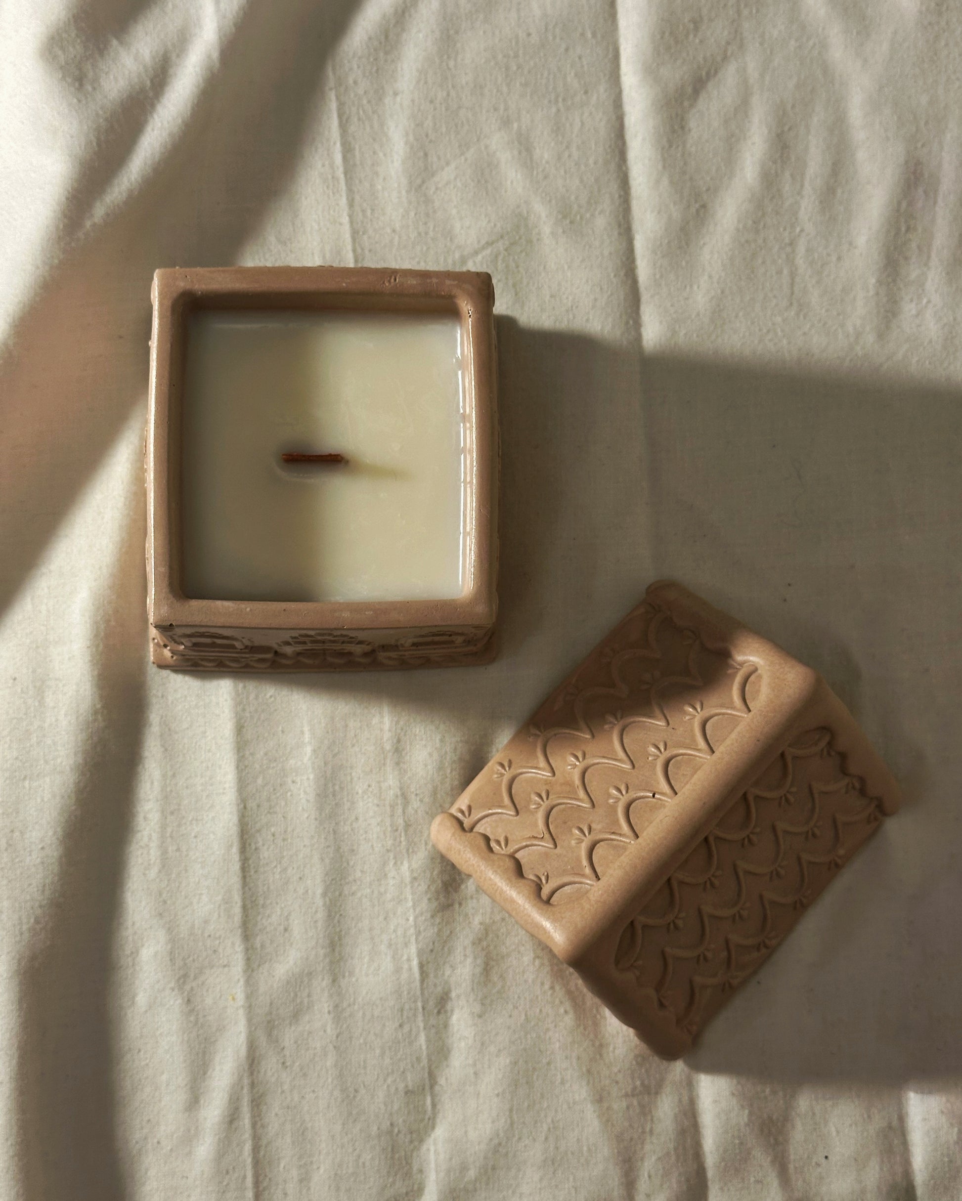 Το κερί (150gr) φιλοξενείται σε μπεζ πορσελάνινο δοχείο με ανάγλυφα σχέδια, ενώ το ξύλινο φυτίλι καίει απαλά, δημιουργώντας ζεστή, cozy ατμόσφαιρα. Το premium blend σόγιας–καρύδας απελευθερώνει το άρωμα Christmas Spices με νότες κανέλας, γαρύφαλλου και ζεστών μπαχαρικών, γεμίζοντας τον χώρο με γιορτινή θαλπωρή.